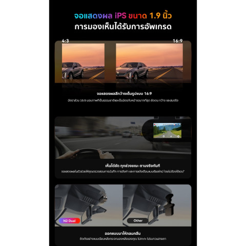 จอ IPS 1.9 นิ้ว (16:9) สีสวย มุมมองกว้าง ตรวจสอบวิดีโอ/การตั้งค่า/การแจ้งเตือนได้ทันทีโดยไม่ต้องพึ่งแอปตลอดเวลา
