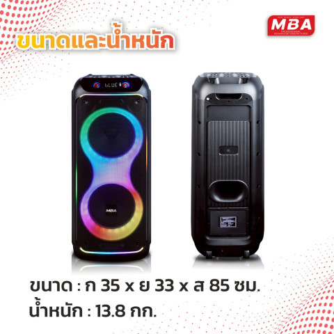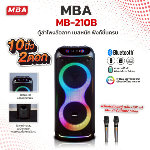MBASOUNDTHAILAND ตู้ลำโพงล้อลาก ขนาด 10 นิ้ว รุ่น MB-210B กำลังขับ 300W ลำโพงบลูทูธเสียงดี พร้อมไมค์ลอยคู่ UHF แท้ สำหรับร้องคาราโอเกะ งานกิจกรรม งานขายหน้าร้าน หรือใช้ในบ้านก็สะดวก คล่องตัวด้วยล้อลากและแบตเตอรี่ในตัว ให้เสียงดังฟังชัด พร้อมไฟ RGB สร้างบรรยากาศได้ทันที