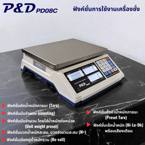 ตาชั่งดิจิตอลนับจำนวน P&D รุ่น PD08C ราคา 5,500.00 บาท เครื่องชั่งที่ออกแบบมาสำหรับงานนับชิ้นงานในคลังสินค้า ร้านอะไหล่ งานผลิต และงานแพ็กกิ้ง ช่วยให้นับจำนวนได้รวดเร็ว แม่นยำ อ่านค่าง่ายด้วยจอ LCD ขนาดใหญ่ พร้อมฟังก์ชันครบสำหรับงานชั่งจริงจัง และรองรับการเชื่อมต่ออุปกรณ์ภายนอกผ่านพอร์ต RS232