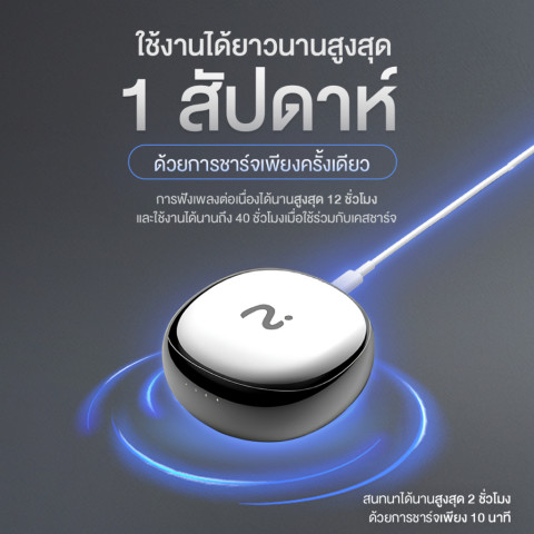 แบตเตอรี่หูฟังความจุ 60 mAh ต่อข้าง และเคสชาร์จ 500 mAh รองรับการฟังเพลงต่อเนื่องกว่า 12 ชั่วโมงต่อการชาร์จหนึ่งครั้ง รวมเคสแล้วใช้งานได้สูงสุดถึง 40 ชั่วโมง เหมาะสำหรับคนที่เดินทางบ่อย ทำงานทั้งวัน หรือชอบฟังเพลงนานๆฉลาดกว่าหูฟังทั่วไปด้วยฟีเจอร์แปลภาษา + บันทึก & สรุป