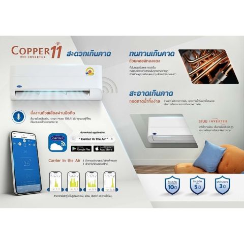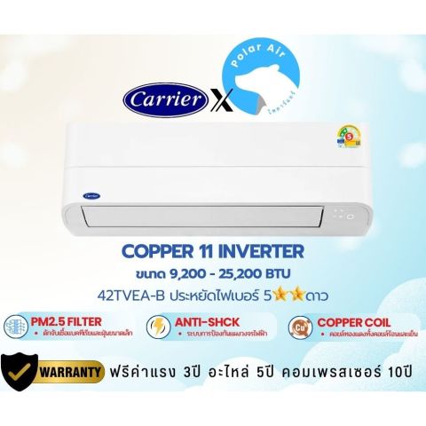แอร์ติดผนัง CARRIER รุ่น COPPER11 TVEA-B INVERTER เบอร์ 5 R32 (18,000 BTU) ราคา 18,430.00 บาท ให้ความเย็นสบายต่อเนื่อง ประหยัดไฟด้วยระบบอินเวอร์เตอร์ พร้อมฟีเจอร์ดูแลอากาศและความสะอาดภายในเครื่อง เหมาะสำหรับบ้าน คอนโด และออฟฟิศที่ต้องการความคุ้มค่าและความทนทาน