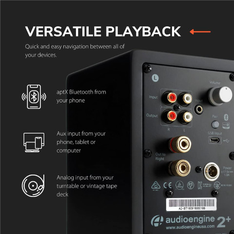 Audioengine A2+ Next Gen (Type-C) Wireless ลำโพงไร้สายขนาดกะทัดรัดระดับพรีเมียมจาก Audioengine ที่ยกระดับการเชื่อมต่อให้ทันสมัยด้วยพอร์ต USB-C พร้อม Bluetooth เพื่อการฟังเพลง ดูหนัง เล่นเกม หรือใช้งานกับคอมพิวเตอร์ได้สะดวกยิ่งขึ้น ให้เสียงชัด รายละเอียดครบ เวทีเสียงโปร่ง เหมาะทั้งโต๊ะทำงาน คอนโด หรือห้องนั่งเล่น