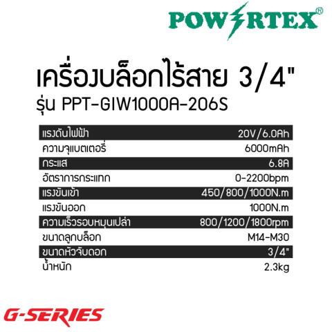 POWERTEX G-Series บล็อกกระแทกไร้สาย 3/4" รุ่น PPT-GIW1000A-206S ให้พลังงานแรงบิดสูงสุดถึง 1000 N.m ในขนาดที่กะทัดรัด พกพาง่าย เหมาะสำหรับงานหนักทั้งในสนามและในอู่ซ่อม ไม่ว่าจะเป็นงานถอด–ขันน็อตล้อรถบรรทุก รถไถ รถแม็คโคร ไปจนถึงงานโครงสร้างเหล็กและเครื่องจักรอุตสาหกรรม เครื่องเดียวเอาอยู่ ครบทั้งพลัง ความทนทาน และความคล่องตัวแบบไร้สาย