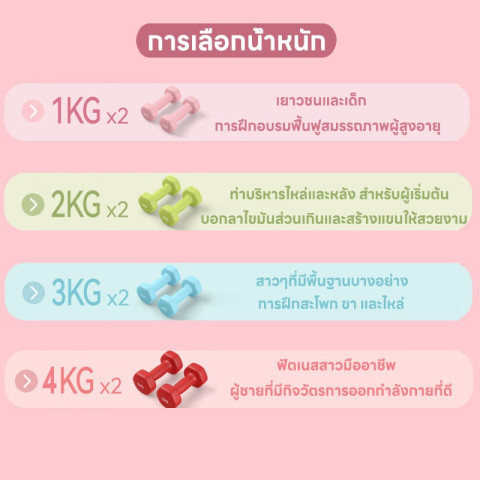 เลือกน้ำหนักได้ตั้งแต่ 1–4 กก. ตามระดับความแข็งแรงของผู้ใช้งาน เหมาะสำหรับผู้หญิงที่เริ่มต้นออกกำลังกาย ผู้ชายที่ต้องการเวทเทรนนิ่งเบา ๆ และคนในครอบครัวที่อยากเริ่มดูแลสุขภาพร่วมกัน