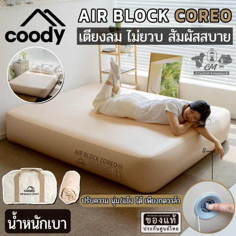 ด้วยเทคโนโลยีโครงสร้างลมรุ่นใหม่ล่าสุดของ Coody รุ่น "AIR BLOCK COREO" ที่นอนรุ่นนี้จึงมีน้ำหนักเบากว่าที่นอนลมทั่วไปถึงประมาณ 52% แต่ยังคงความแข็งแรง รองรับน้ำหนักได้ดี และให้สัมผัสการนอนที่นุ่มแน่น รองรับสรีระได้อย่างยอดเยี่ยม ความหนา 35 ซม. ช่วยยกตัวคุณให้ลอยเหนือพื้นดิน ลดความเย็นและความชื้นจากพื้น พร้อมทั้งลดแรงสั่นสะเทือนเมื่อลุกหรือขยับตัว