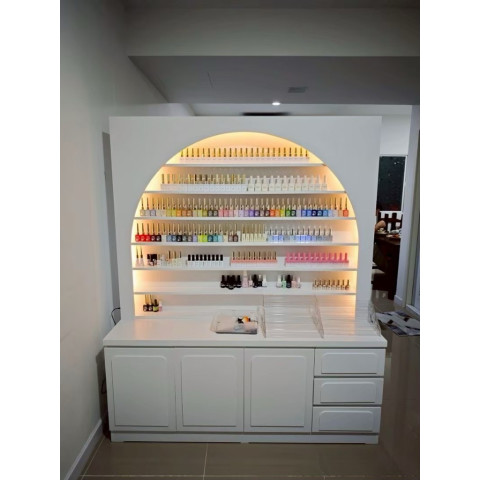 เปลี่ยนมุมทำเล็บของคุณให้เป็นโชว์รูมสุดหรูด้วย ชั้นวางสีเจล กว้าง 150 ซม. รุ่นหน้าโค้ง ชั้นวางดีไซน์โค้งมนสวยงาม ช่วยโชว์สีเจลได้ครบ ค้นหาง่าย หยิบใช้สะดวก พร้อมไฟเหลืองเพิ่มความโดดเด่นให้สีเจลทุกขวด ดูสวยสะดุดตาเหมือนหน้าร้านมืออาชีพ
