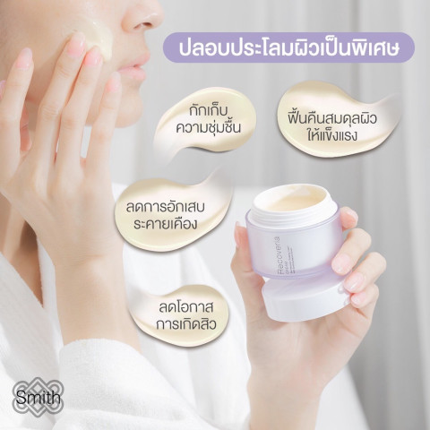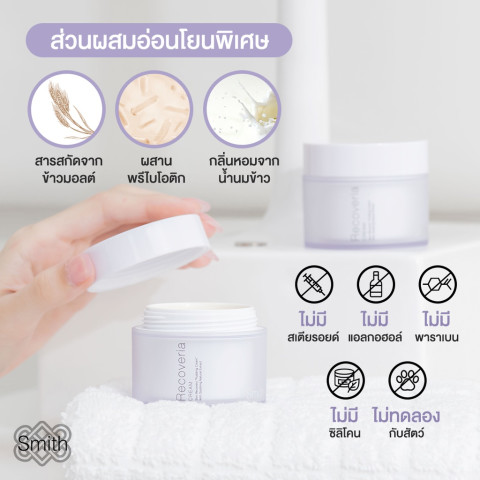 สัมผัสประสบการณ์การฟื้นบำรุงผิวอย่างอ่อนโยนด้วย Smith Recoveria Cream ขนาด 8g. (สำหรับแจกฟรีเท่านั้น – Not for Sale) Exp 12/2026 ครีมบำรุงผิวเนื้อพุดดิ้งที่ถูกออกแบบมาเพื่อปลอบประโลมผิวที่บอบบาง แพ้ง่าย หรือระคายเคือง ให้กลับมาดูชุ่มชื้น สุขภาพดี และแข็งแรงขึ้นอย่างอ่อนโยนในทุกวัน