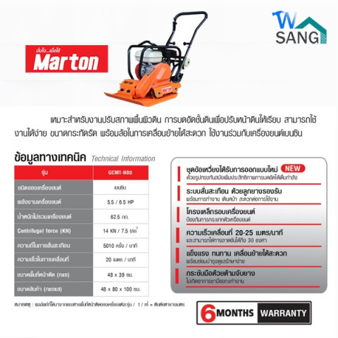 หากคุณกำลังมองหาเครื่องตบดินที่ให้แรงบดอัดสูง ใช้งานง่าย ทนทาน และคุ้มค่าต่อการลงทุน เครื่องตบดิน MARTON รุ่น GCMT-N80 ขนาด 7-8 ตัน คือทางเลือกที่ตอบโจทย์ทุกงานหน้างานของคุณ ช่วยให้พื้นดินแน่น แข็งแรง รองรับงานโครงสร้างได้อย่างมั่นใจในทุกโปรเจกต์