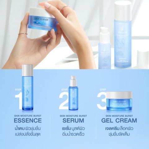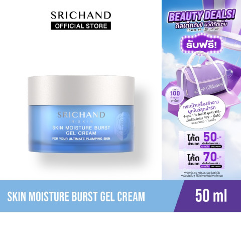 SRICHAND ศรีจันทร์สกิน มอยส์เจอร์ เบิร์ส เจล ครีม (Skin Moisture Burst Gel Cream) ขนาด 50 มล. เจลครีมเนื้อบางเบา ซึมไว สบายผิว ออกแบบมาเพื่อเติมและล็อกความชุ่มชื้นให้ผิวดูอิ่มฟู สุขภาพดี พร้อมช่วยปลอบประโลมผิว เหมาะสำหรับใช้ได้ทั้งเช้า-ก่อนนอน ให้ผิวชุ่มชื้นยาวนานสูงสุดถึง 72 ชม.*