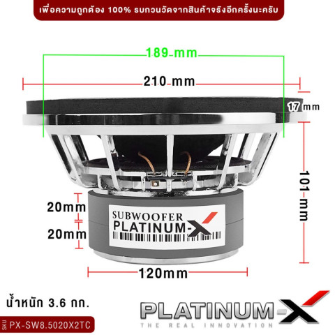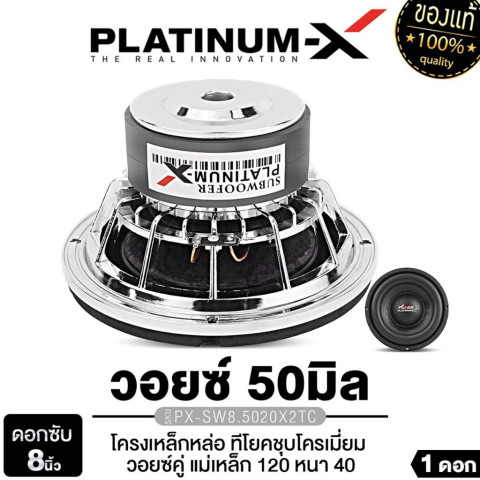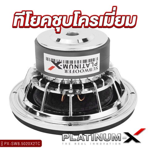 PLATINUM-X ลำโพงซับวูฟเฟอร์ 8 นิ้ว เบส 1 ดอก วอยซ์คู่ โครงเหล็กปั๊ม/หล่อ ชุบโครเมียม รุ่น PX-SW8.5020X2TC / PT-SQL845.2EURO ในราคา 2,976.00 บาท เติมมิติย่านต่ำให้แน่น ลึก และกระชับ เหมาะสำหรับอัปเกรดระบบเครื่องเสียงรถยนต์ที่ต้องการ “ลูกเบส” ชัดเจน ฟังได้ทุกแนว ตั้งแต่ EDM ไปจนถึงลูกทุ่ง/ร็อก ด้วยดีไซน์พรีเมียม โครงสร้างแข็งแรง และวอยซ์คอยล์ขนาดใหญ่ ให้แรงขับดี ตอบสนองไว