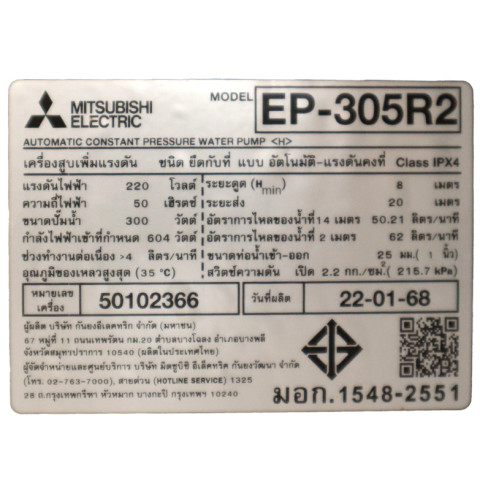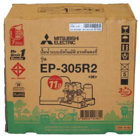 MITSUBISHI ปั๊มน้ำอัตโนมัติ (ถังเหลี่ยม) รุ่น EP-305R2 ขนาด 300W สีเหลือง ของแท้ 100% มั่นใจคุณภาพ พร้อมรับประกันมอเตอร์ยาวนาน 11 ปีโดยผู้ผลิต เหมาะสำหรับบ้านพักอาศัย 2-3 ชั้น ให้แรงดันน้ำคงที่ น้ำไหลสม่ำเสมอ ใช้งานได้ทนทานและปลอดภัย