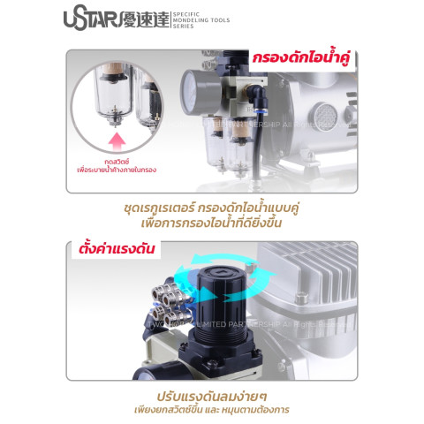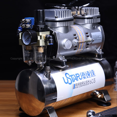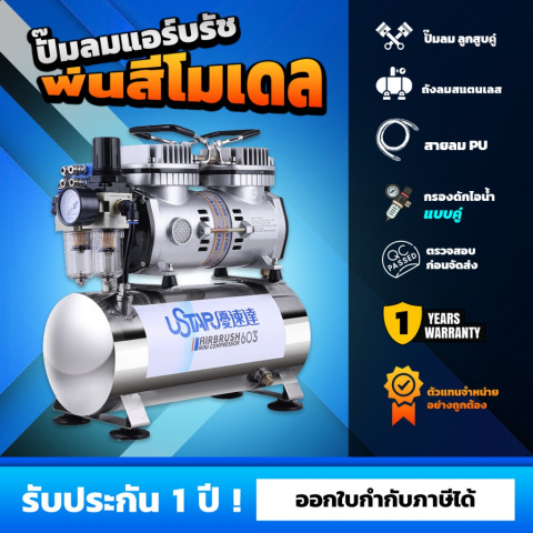 USTAR ปั๊มลมแอร์บรัชพ่นสี รุ่น U603 แบบมีถังพักสแตนเลส 4 ลิตร ตัวช่วยงานพ่นสีที่ให้ลมเสถียร เงียบ และสะอาด เหมาะทั้งงานโมเดล กันดั้ม งานศิลปะ ไปจนถึงงานพ่นสี 3D ใช้งานได้สบายแม้อยู่ห้องพัก/คอนโด ด้วยระบบ Oil Free ลูกสูบคู่ อัดลมไว ตอบสนองทันใจ พร้อมชุดกรองดักไอน้ำแบบกรองคู่ ช่วยลดความชื้น ป้องกันงานสีเป็นเม็ดหรือด่าง