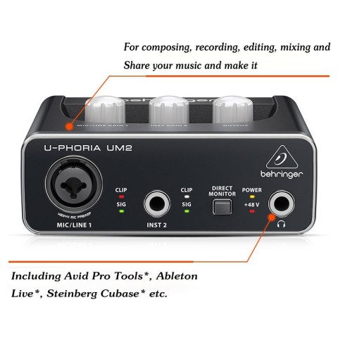 Behringer U-Phoria ซีรีส์ (UM2 / UMC22 / UMC202HD / UMC204HD / UMC404HD) อินเทอร์เฟซเสียง USB คุณภาพคุ้มค่า สำหรับสายอัดเสียง ทำเพลง ไลฟ์สตรีม พอดแคสต์ และงานบันทึกเสียงที่ต้องการความเสถียร พร้อมพรีแอมป์ไมค์คุณภาพสูง (XENYX หรือ Midas-designed) และ 48V Phantom Power รองรับไมโครโฟนคอนเดนเซอร์ ใช้งานได้กับซอฟต์แวร์ยอดนิยมอย่าง Pro Tools, Ableton Live, Cubase และอื่น ๆ บน Mac/Windows ให้คุณได้เสียงใส ชัด และหน่วงต่ำ เหมาะทั้งมือใหม่และผู้ใช้งานจริงจัง