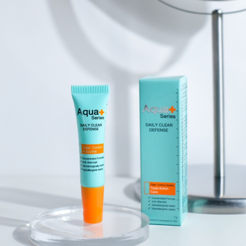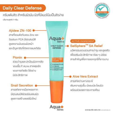 (ส่งฟรี) Aqua+ Series Daily Clear Defense 7 g. ครีมแต้มสิวเนื้อเข้มข้นที่ออกแบบมาเพื่อผิวที่มีแนวโน้มเป็นสิวง่าย ดูแลสิวอย่างอ่อนโยนแต่ตรงจุด ช่วยให้สิวอักเสบแห้งและยุบตัว พร้อมลดโอกาสการอุดตันและการเติบโตของเชื้อแบคทีเรีย โดยไม่ทำให้ผิวแห้งตึง ลอกเป็นขุย และไม่ทิ้งคราบ แต่งหน้าต่อได้สบาย