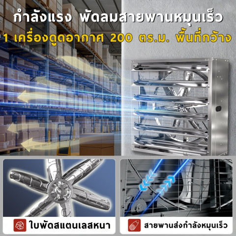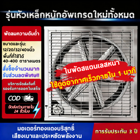 พัดลมอุตสาหกรรมใบพัดสแตนเลส 20/32/40 นิ้ว กำลังไฟ 400W โซลูชันระบายอากาศประสิทธิภาพสูงสำหรับพื้นที่กว้าง เหมาะกับโรงงาน คลังสินค้า และฟาร์มที่ต้องการลมแรง ระบายอากาศไว ลดความอับชื้นและกลิ่นสะสม โดยพัดลม 1 เครื่องสามารถช่วยดูด/ถ่ายเทอากาศได้ครอบคลุมพื้นที่ได้สูงสุดประมาณ 200 ตร.ม. (ขึ้นอยู่กับสภาพหน้างาน)