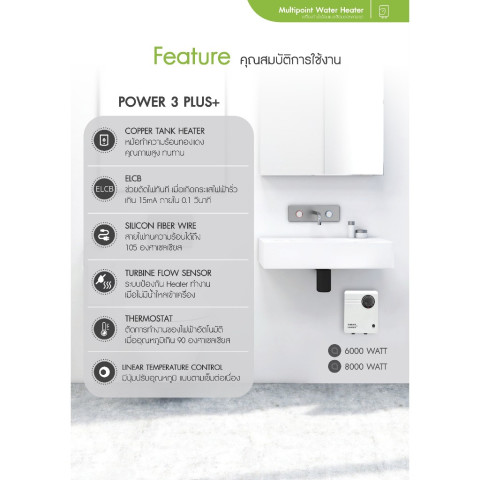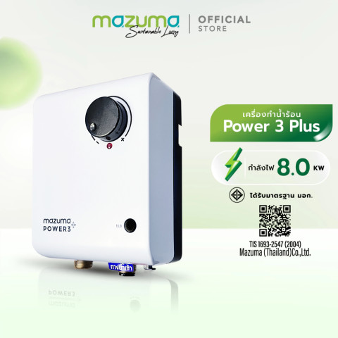 Mazuma เครื่องทำน้ำร้อนไฟฟ้า รุ่น POWER 3+ กำลังไฟ 8000W มอบน้ำร้อนแบบ “ผ่านร้อนทันที” ใช้งานได้ต่อเนื่อง ออกแบบให้รองรับการใช้งานร่วมกับวาล์วผสมและใช้งานได้หลายจุด เหมาะทั้งบ้านพักอาศัย คอนโด โรงแรม ห้องครัว ไปจนถึงสถานพยาบาล ด้วยฮีตเตอร์ทองแดงแท้ 100% ให้ความร้อนรวดเร็ว ทนทาน และอุ่นใจด้วยระบบความปลอดภัยครบครัน พร้อมหน้าปัดปรับกำลัง/อุณหภูมิด้านหน้าเครื่อง ติดตั้งง่าย ตัวเครื่องขนาดกะทัดรัด