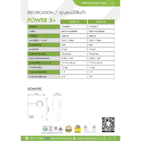 เลือก Mazuma POWER 3+ 8000W เพื่อประสบการณ์ใช้น้ำร้อนที่แรง เสถียร ปลอดภัย และคุ้มค่าสำหรับทุกพื้นที่ของคุณ