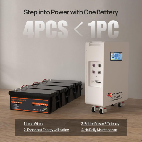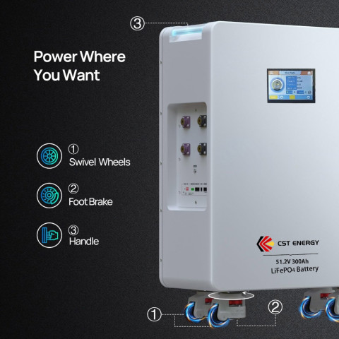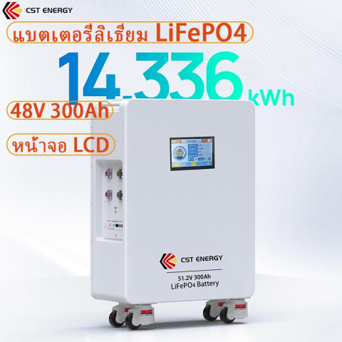 CST ENERGY 48V 300Ah (51.2V) LiFePO4 แบตเตอรี่ลิเธียมสำหรับบ้าน/ไฟสำรอง/ระบบโซลาร์ มาพร้อม BMS ในตัว 200A และ ลูกกลิ้งพร้อมระบบล็อก เคลื่อนย้ายง่าย ติดตั้งสะดวก ให้พลังงานก้อนเดียวได้ถึง 14.336kWh เหมาะทั้งระบบออนกริด ออฟกริด และโหมดสแตนด์บาย ใช้งานยาวนาน คุ้มค่าในระยะยาว