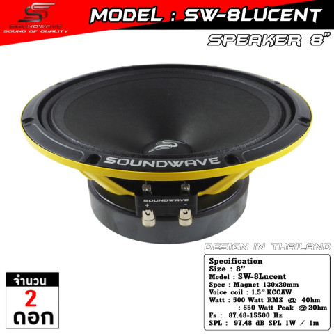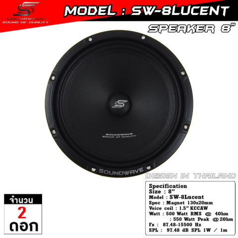 ลำโพง 8 นิ้ว SW-8Lucent | SOUNDWAVE ดอกลำโพงเสียงกลางรถยนต์คุณภาพพรีเมียม ประกอบไทย ให้โทนเสียงกลางใส เคลียร์ รายละเอียดชัด ฟังเพลงมีมิติ พร้อมพลัง “โมแรง” แบบลงตัว เหมาะทั้งสายฟังคุณภาพและสายอัปเกรดระบบเครื่องเสียงให้เสียงร้อง/เมโลดี้เด่นขึ้นทันที