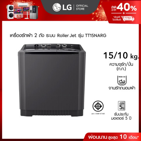 LG เครื่องซักผ้า 2 ถัง รุ่น TT15NARG ตัวช่วยซักผ้าสำหรับครอบครัวที่ต้องการความจุใหญ่และซักได้สะอาดอย่างมั่นใจ ด้วยความจุซัก 15 กก. รองรับผ้ากองใหญ่ได้สบาย พร้อมระบบ Roller Jet ที่ช่วยขจัดคราบได้ดีขึ้น โดยยังคงความอ่อนโยนต่อเนื้อผ้า เหมาะทั้งเสื้อผ้าประจำวัน ผ้าห่มบาง ๆ และงานซักที่ต้องการความรวดเร็ว