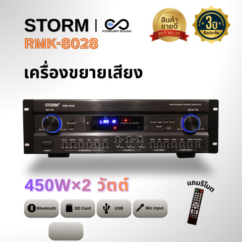 STORM รุ่น RMK-8028 เพาเวอร์แอมป์คาราโอเกะ 450W×2 RMS ยกระดับเสียงร้องและเสียงดนตรีให้ “แน่น ชัด ทรงพลัง” เหมาะทั้งห้องคาราโอเกะในบ้าน ร้านอาหาร ไปจนถึงงานสังสรรค์ที่ต้องการพลังขับแบบมืออาชีพ ด้วยกำลังขับ 450W×2 (RMS) ให้รายละเอียดเสียงคมชัด มิติดี เบสหนักแน่นกว่ารุ่นทั่วไป พร้อมรองรับการใช้งานที่หลากหลายทั้ง Bluetooth/USB และไมค์ได้พร้อมกันถึง 4 ช่อง ให้คุณร้องได้ยาว ๆ แบบไม่สะดุด