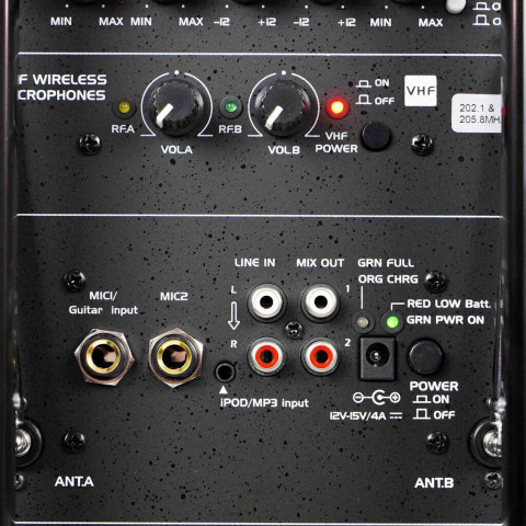 ช่องต่อ: ไมค์สาย 2 ช่อง, Line-in (รองรับกีต้าร์/ไอพอด), Line-in, Mix-out, AUX, ปุ่มตัดเสียง