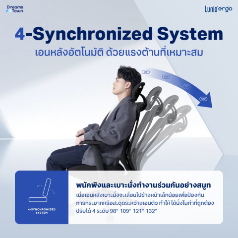 4-Synchronized System ระบบโยกเอนรักษาสมดุล ปรับได้ 4 ระดับ เอนสูงสุด 132°