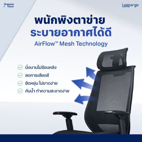 AirFlow™ Mesh Technology พนักพิงตาข่าย ระบายอากาศดี ลดอับชื้น นั่งนานไม่ร้อนหลัง