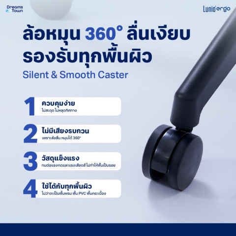 Silent & Smooth Caster ล้อหมุน 360° ลื่นเงียบ ไม่สะดุด ปลอดภัยต่อหลายพื้นผิว