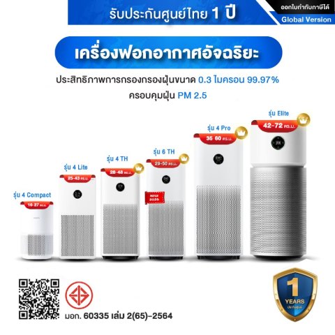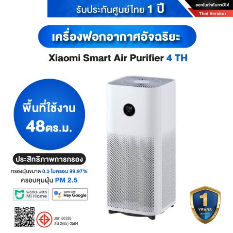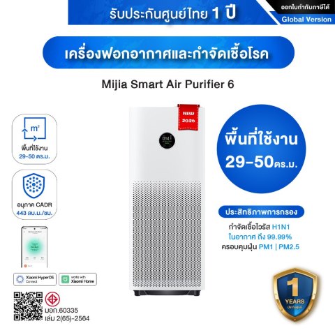 ใช้งานพื้นที่ 72 ตร.ม. และครอบคลุมอย่างมีประสิทธิภาพ 125 ตร.ม. ภายใน 1 ชั่วโมง (กรองได้ 2 รอบ) พร้อมระบบฆ่าเชื้อ 3 ชั้น (เคลือบป้องกัน 2 ชั้น + U-V + พลาสมาพลังงานสูง) และไส้กรองแบบค่อยเป็นค่อยไป 6 ชั้น ช่วยลดกลิ่น สารก่อภูมิแพ้ ฝุ่น และมลพิษในบ้านXiaomi Smart Air Purifier 6 TH – รุ่นที่ระบุชื่อในรายการสินค้า (รายละเอียดสเปคไม่ได้ระบุมา)