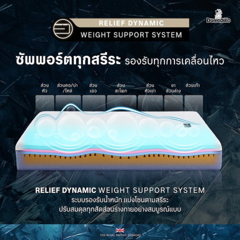 ด้วยชั้น Body Care Topper โฟม High Density นำเข้าจากอังกฤษ ช่วยกระจายน้ำหนัก ลดแรงกดทับ เพิ่มความนุ่มสบายแบบพอดีตัว และเสริมความมั่นคงในการรองรับด้วย Relief Dynamic Weight Support Foam System ที่แบ่งโซนรองรับน้ำหนักเพื่อปรับสมดุลตั้งแต่ศีรษะจรดปลายเท้า ช่วยจัดระนาบกระดูกสันหลังให้เหมาะสมตามหลักสรีรศาสตร์