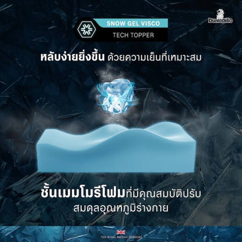 ผสานพลังความเย็นจาก SNOWTEMP Fabric เส้นใยนวัตกรรมช่วยกักเก็บความเย็นและปรับอุณหภูมิให้เหมาะกับการนอน ลดความร้อนสะสมบนผิวหน้าเตียง เสริมด้วย Snow Gel Visco Tech Topper อนุภาคเจลเย็นที่ช่วยคงความเย็น ระบายความร้อนและความอับชื้น พร้อมชั้นรองรับ Visco Tech ที่ดูดซับแรงกดทับและรองรับสรีระได้มากกว่าเมมโมรีโฟมทั่วไปถึง 4 เท่า ให้ความผ่อนคลายตลอดคืน
