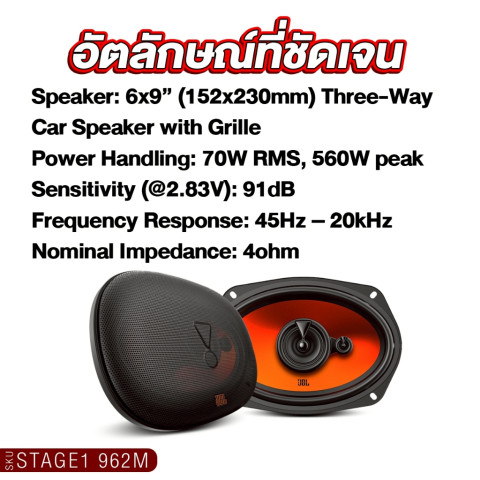 JBL STAGE1 962M ลำโพงแกนร่วม 3 ทางจากแบรนด์เสียงระดับโลก โดดเด่นด้วยกรวยวูฟเฟอร์ Plus One™ ที่ให้พื้นที่หน้ากรวยมากขึ้น ทำให้เบสลึก หนักแน่น และมีพลัง พร้อมทวีตเตอร์แบบ PEI Balanced Dome ที่ให้เสียงแหลมใสไม่บาดหู ฟังสนุกทุกแนวเพลงขนาดลำโพง: 6 x 9 นิ้ว แกนร่วม 3 ทาง