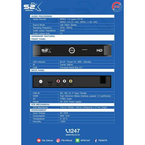 PSI S2X HD มาพร้อมระบบประมวลผล CPU Dual Core เร็วขึ้นกว่าเดิมถึง 15% สลับช่องลื่นไหล ไม่หน่วง รองรับความคมชัดสูงสุดในระบบ 1080HD (High Definition) ให้ภาพคมชัด สีสันสดใส ดูสบายตา ใช้งานได้กับทั้งระบบ KU-Band (รับชมได้กว่า 100 ช่อง) และ C-Band (รับชมได้กว่า 200 ช่อง) ครอบคลุมทุกความบันเทิงในบ้าน