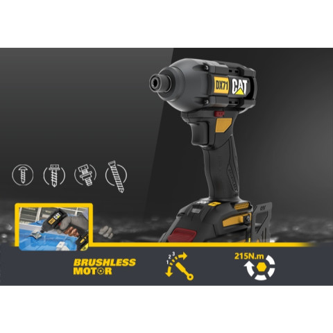 CATERPILLAR ไขควงกระแทกไร้สาย รุ่น DX71 6.35mm (1/4") 215N.m 18V MAX ของแท้ รับประกันศูนย์ CAT 3 ปี เหมาะสำหรับช่างมืออาชีพและงานซ่อมบำรุงที่ต้องการพลัง ขันน็อต–สกรูได้รวดเร็ว แรงบิดสูง แต่น้ำหนักเบา จับถนัดมือ ใช้งานสะดวกทั้งในไซต์งานและงานติดตั้งทั่วไป