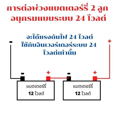 ระบบ 24V: แบตขั้นต่ำ 50–200Ah ใช้ 2 ลูก (Ah เท่ากัน) แผงรวมไม่เกิน 1040W