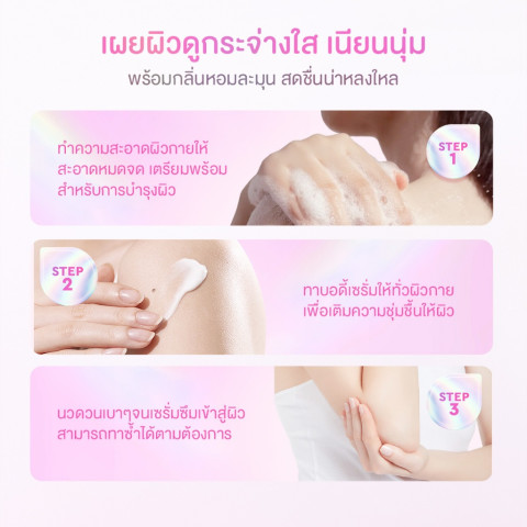 ใช้หลังอาบน้ำหรือตามต้องการ ทาเซรั่มให้ทั่วผิวกาย
