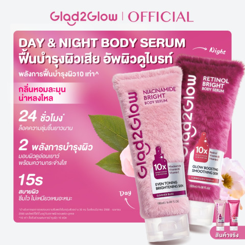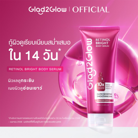 ปลุกผิวให้กลับมาดูเปล่งประกายมีออร่าตลอดวันด้วย Glad2Glow Brightening Body Serum Moisturising Lotion Retinol เซ็ตเซรั่มบำรุงผิวกาย 2 สูตรในเซ็ตเดียว เซ็ตโลชั่นเซรั่มเนื้อบางเบา ซึมไว ไม่เหนียวเหนอะหนะ มอบทั้งผิวดูกระจ่างใส และผิวเนียนนุ่มกระชับ อ่อนเยาว์ ในขั้นตอนเดียว เหมาะสำหรับผู้ที่ต้องการบำรุงผิวแบบจัดเต็มทั้งกลางวันและกลางคืน