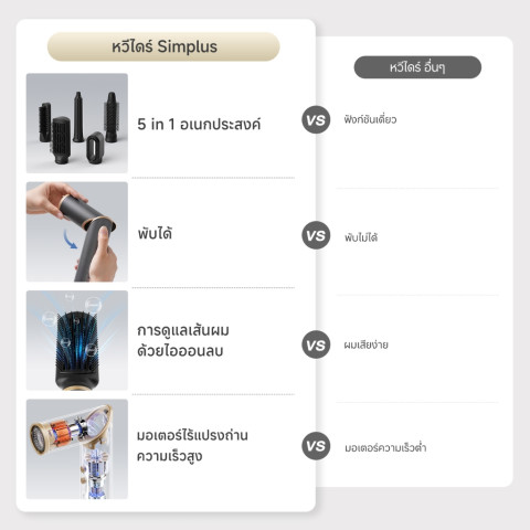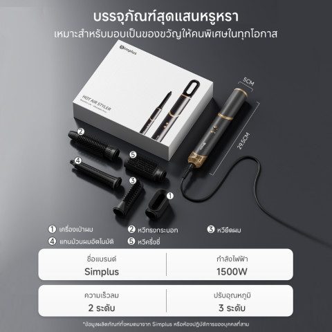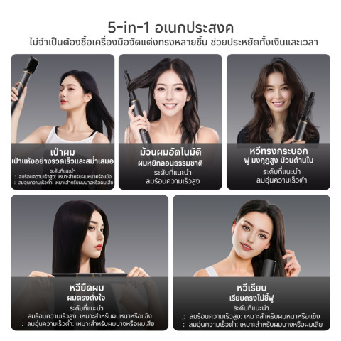 มัลติฟังก์ชั่น 5-in-1 – มาพร้อมอุปกรณ์เสริมครบชุด 5 ชิ้น ทั้งเป่า ยืด ม้วน และจัดทรง ให้คุณเปลี่ยนลุคได้หลากหลายสไตล์ด้วยเครื่องเดียว
