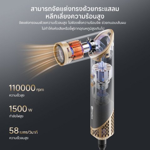 มอเตอร์ไร้แปรงถ่าน 110,000 รอบ/นาที – ทรงพลังแต่เงียบ เป่าผมแห้งเร็ว ประหยัดเวลา พร้อมความเร็วลม 2 ระดับ และปรับอุณหภูมิได้ 3 ระดับ ปรับให้เหมาะกับสภาพเส้นผมของคุณ
