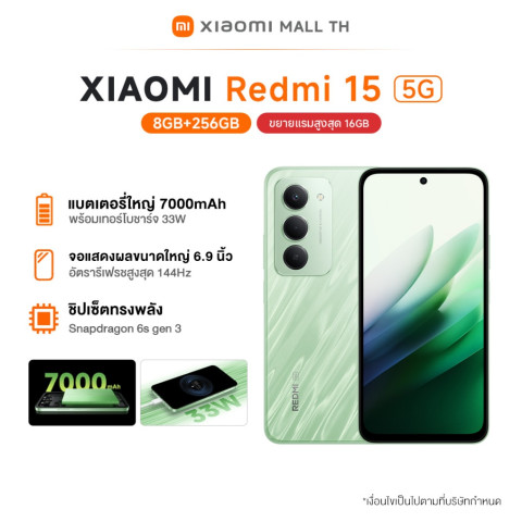 [New] Xiaomi Redmi 15 (8+256) / Redmi 15 5G (8+256) สมาร์ทโฟนรุ่นใหม่ล่าสุดที่ออกแบบมาเพื่อตอบโจทย์ทุกการใช้งานของคนยุคดิจิทัล ทั้งสายโซเชียล สายเกม สายทำงาน หรือสายถ่ายรูป มาพร้อมดีไซน์สุดโมเดิร์น สีเขียว Green 5G สวยสะดุดตา บางเบาหรูหรา จับถนัดมือ และรองรับเครือข่าย 5G เพื่อประสบการณ์การใช้งานที่ลื่นไหลไม่มีสะดุด ในราคาคุ้มค่าที่คุณเป็นเจ้าของได้ง่ายๆ
