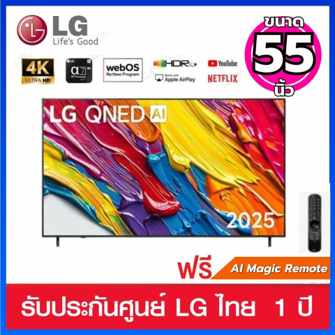 LG QNED AI 4K Smart TV 2025 รุ่น 55QNED70ASA (55 นิ้ว) พร้อม AI Magic Remote ยกระดับความบันเทิงในบ้านด้วยภาพ 4K ที่คมชัด สีสันสดใสจากการผสาน Quantum Dot + NanoCell บนเทคโนโลยีหน้าจอ QNED พร้อม Direct Backlight ให้คอนทราสต์ดี รายละเอียดชัดทุกมุมมอง เสริมความลื่นไหลในการใช้งานด้วย Alpha 7 AI Processor 4K Gen8 ที่ช่วยอัปสเกลคอนเทนต์ให้ใกล้เคียง 4K และปรับภาพให้เหมาะกับฉากที่กำลังรับชม