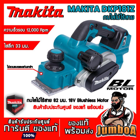 MAKITA DKP181Z (เครื่องเปล่า) กบไสไม้/กบไฟฟ้าไร้สาย 18V ขนาดหน้ากว้าง 82 มม. มาพร้อม มอเตอร์ไร้แปรงถ่าน (Brushless) ให้แรงสม่ำเสมอ เดินเครื่องลื่น เหมาะสำหรับงานไสปรับผิวไม้ งานประกอบเฟอร์นิเจอร์ งานช่างไม้ทั้งหน้างานและในโรงงาน โดยรุ่นนี้เป็น เฉพาะตัวเครื่อง ไม่รวมแบตเตอรี่และแท่นชาร์จ