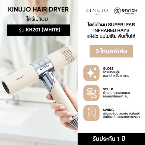 KINUJO Hair Dryer (White) ไดร์เป่าผมขายดีอันดับ 1 จากญี่ปุ่น ที่ยกระดับการเป่าผมให้ “แห้งเร็ว x3” พร้อมช่วยลดความเสี่ยงผมแห้งเสียจากความร้อน ด้วยเทคโนโลยีใหม่ที่ให้ความร้อนอย่างอ่อนโยนจากภายใน ช่วยให้ผมดูเงางาม เรียบลื่น ไม่ชี้ฟู เหมาะทั้งใช้ทุกวันและพกพาเวลาเดินทาง