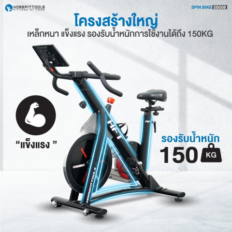 จักรยานออกกำลังกาย/จักรยานฟิตเนส สปินไบค์ Spinning Bike รุ่น SB008 - Homefittools ราคา 9,999.00 บาท ตัวช่วยปั้นหุ่นที่ตอบโจทย์คนอยากลดน้ำหนักและรักการปั่นจักรยาน แต่มีเวลาจำกัด ไม่ต้องออกไปข้างนอกก็ทำคาร์ดิโอได้เต็มที่ที่บ้าน พร้อมโหมดการออกกำลังกายแบบ HIIT (หนักสลับเบา) ช่วยเร่งการเผาผลาญไขมันได้รวดเร็วแม้ใช้เวลาไม่นาน อีกทั้งยังช่วยเสริมความแข็งแรงทั้งร่างกาย โดยเฉพาะช่วงขา และช่วยดูแลสุขภาพหัวใจและหลอดเลือดให้แข็งแรงยิ่งขึ้น