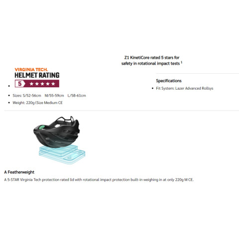 เริ่มต้นจากดีไซน์ตำนานของ Z1 ที่นักปั่นชื่อดังอย่าง Andre Greipel เคยสวมบน Champs Elysees และยกระดับขึ้นไปอีกด้วยเทคโนโลยี KinetiCore (สิทธิบัตรของ Lazer) ที่ช่วยซับแรงกระแทก พร้อมระบบป้องกันแรงกระแทกแบบหมุนในตัว ได้คะแนนความปลอดภัย Virginia Tech 5 ดาว และผ่านมาตรฐาน CE ในขณะที่ยังคงน้ำหนักเบาเพียง 220 กรัม (ไซซ์ M มาตรฐาน CE)