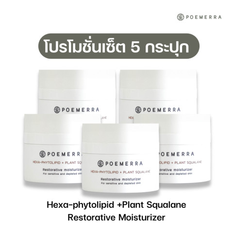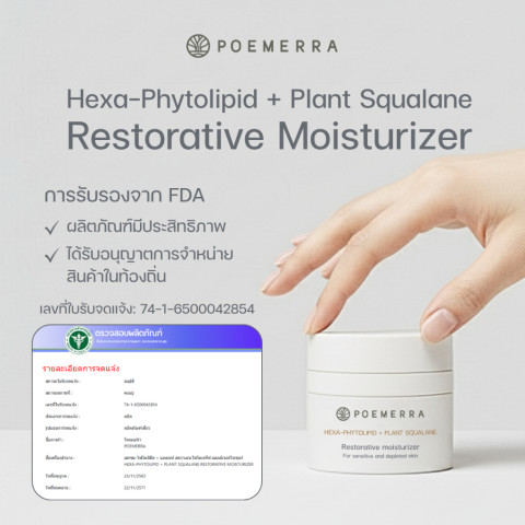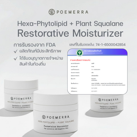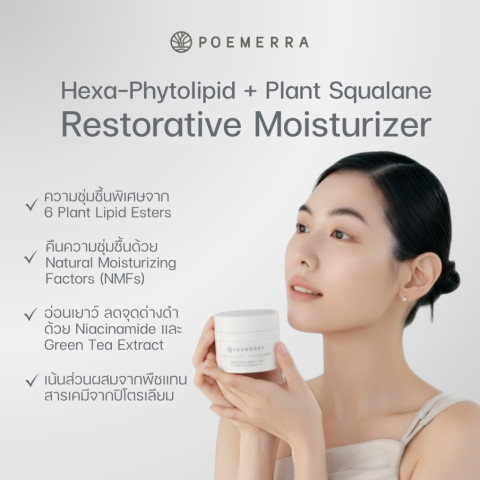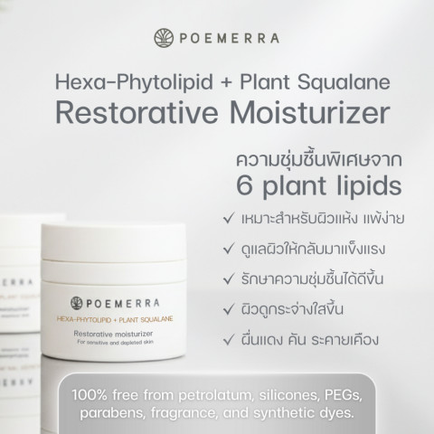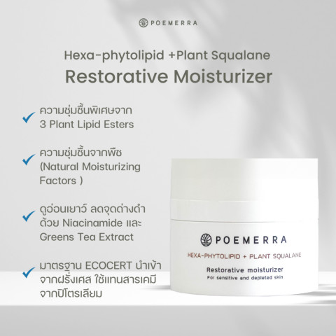 Poemerra Hexa-phytolipid + Plant Squalane Restorative Moisturiser (Intensive Moisturizer) โดดเด่นด้วยส่วนผสมให้ความชุ่มชื้นพิเศษจาก Plant Lipids 3 ชนิด มาตรฐาน ECOCERT นำเข้าจากฝรั่งเศสเพื่อผลิตภัณฑ์นี้โดยเฉพาะ ช่วยทดแทนสารเคมีจากปิโตรเลียม ให้ผิวชุ่มชื้นล้ำลึกแบบ “แน่นแต่เบา” ผิวดูนุ่มลื่น สุขภาพดีขึ้นอย่างสัมผัสได้