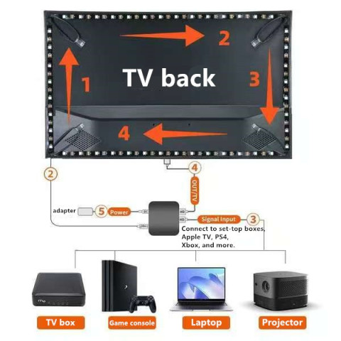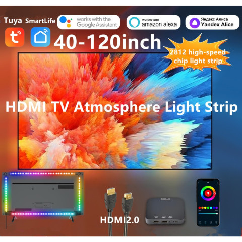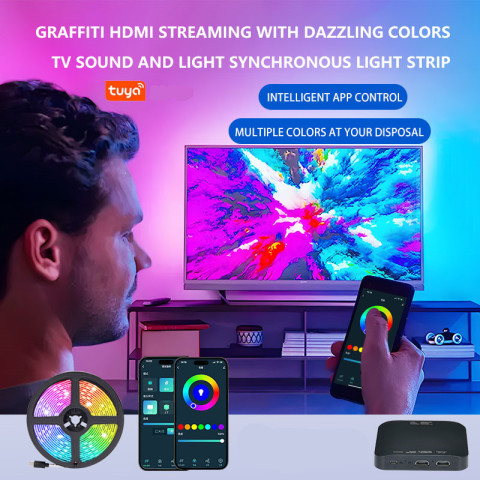 TUYA Wifi สมาร์ท HDMI2.0 TV ไฟเส้นติดหลังทีวี RGBIC ยกระดับการดูหนังและเล่นเกมให้ “อินกว่าเดิม” ด้วยแถบไฟแบ็คไลท์ความเข้มสูงที่ซิงค์สีแบบเรียลไทม์ผ่านกล่อง Sync จากสัญญาณ HDMI ให้แสงไล่เฉดรอบจออย่างนุ่มนวล เพิ่มมิติภาพ ลดความล้าตา และสร้างบรรยากาศเหมือนอยู่ในโรงภาพยนตร์ที่บ้าน