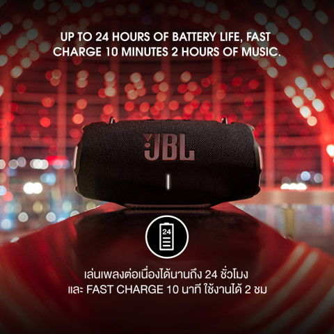 เติมเต็มทุกโมเมนต์ด้วยเสียงคุณภาพจาก JBL Xtreme 4 เลือกตัวเดียวที่พร้อมลุยทุกที่ พร้อมให้คุณสนุกได้ยาว ๆ และสะดวกยิ่งขึ้นด้วยความสามารถในการชาร์จอุปกรณ์ระหว่างทาง