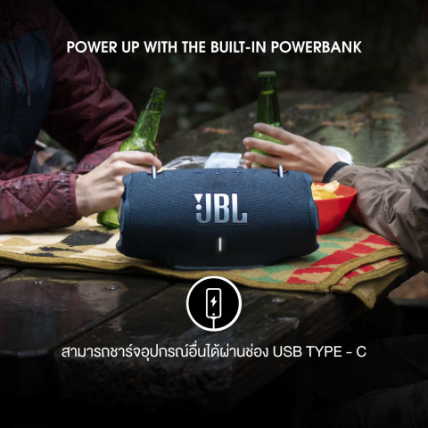 ยิ่งไปกว่านั้น JBL Xtreme 4 ยังมาพร้อม Built-in Powerbank ชาร์จอุปกรณ์ของคุณได้ในระหว่างเดินทาง เพิ่มความอุ่นใจเมื่อแบตมือถือใกล้หมด เหมาะสำหรับคนที่ต้องการลำโพงตัวเดียวจบ ทั้งความบันเทิงและความสะดวกสบาย